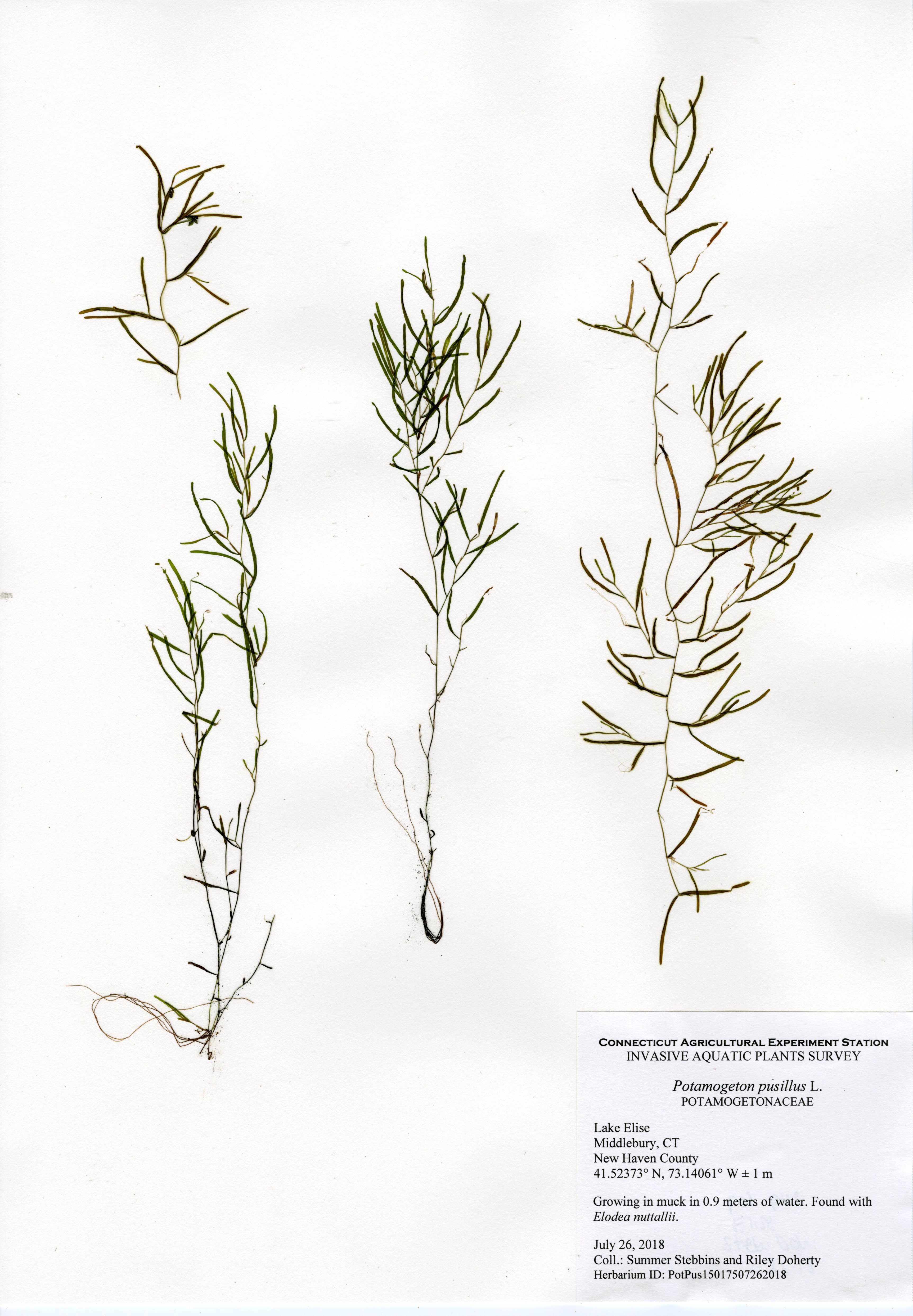 In 2018, CAES IAPP performed a resurvey of Lake Elise, the first survey done in 2011. Ten species were found, a decrease from fifteen in 2011. The same invasive species, fanwort (Cabomba caroliniana), was found in 2018, though at a much lower abundance. In 2011, it formed a thick ring around the entire perimeter, but in 2018 it was much patchier. Fanwort was still the dominant species in the lake, but the nine native species were more abundant in the northeastern portion of the lake. Overall, the aquatic plant abundance was less than found in 2011, with very little found along the western and southern perimeter.