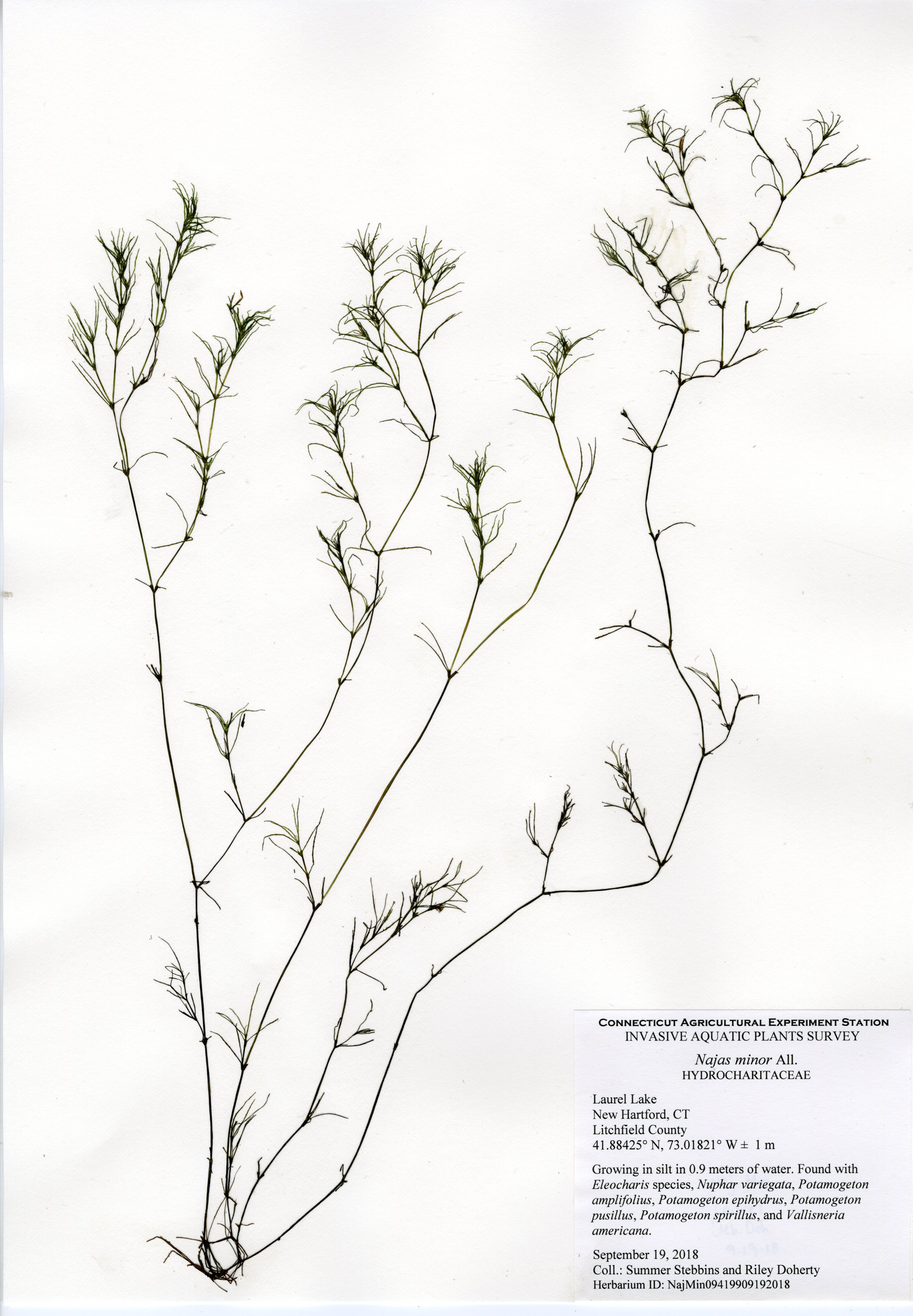 The CAES IAPP performed the third survey of the lake in 2018. The first survey was in 2012, the second in 2013. Compared to previous surveys, aquatic plant species were much less abundant. The same two invasive species were found, brittle waternymph (Najas minor) and phragmites (Phragmites australis), however less abundant. A new patch of phragmites was discovered near the dam at the northern end, and brittle waternymph was only found at the southern end of the lake.