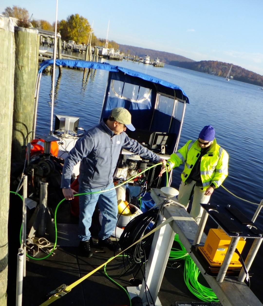 Another site researched during the survey was an area of the Connecticut River in which 27 American ships captured and burned by the British during the War of 1812 may have sunk. The research team began surveying within Essex Harbor, then went out into the river. Steve Schmidt, RCG&A’s Senior Nautical Archaeologist, noting the difficulty of search, suggested in a newspaper article about the survey that “some of those vessels burned by the British may be buried under sediments” and would only be detectable with the remote sensing equipment if metal parts were still present and had not been salvaged at the time (Judy Benson, “Marine archaeologists search Connecticut River for historic artifacts,” The Day, November 27, 2015).