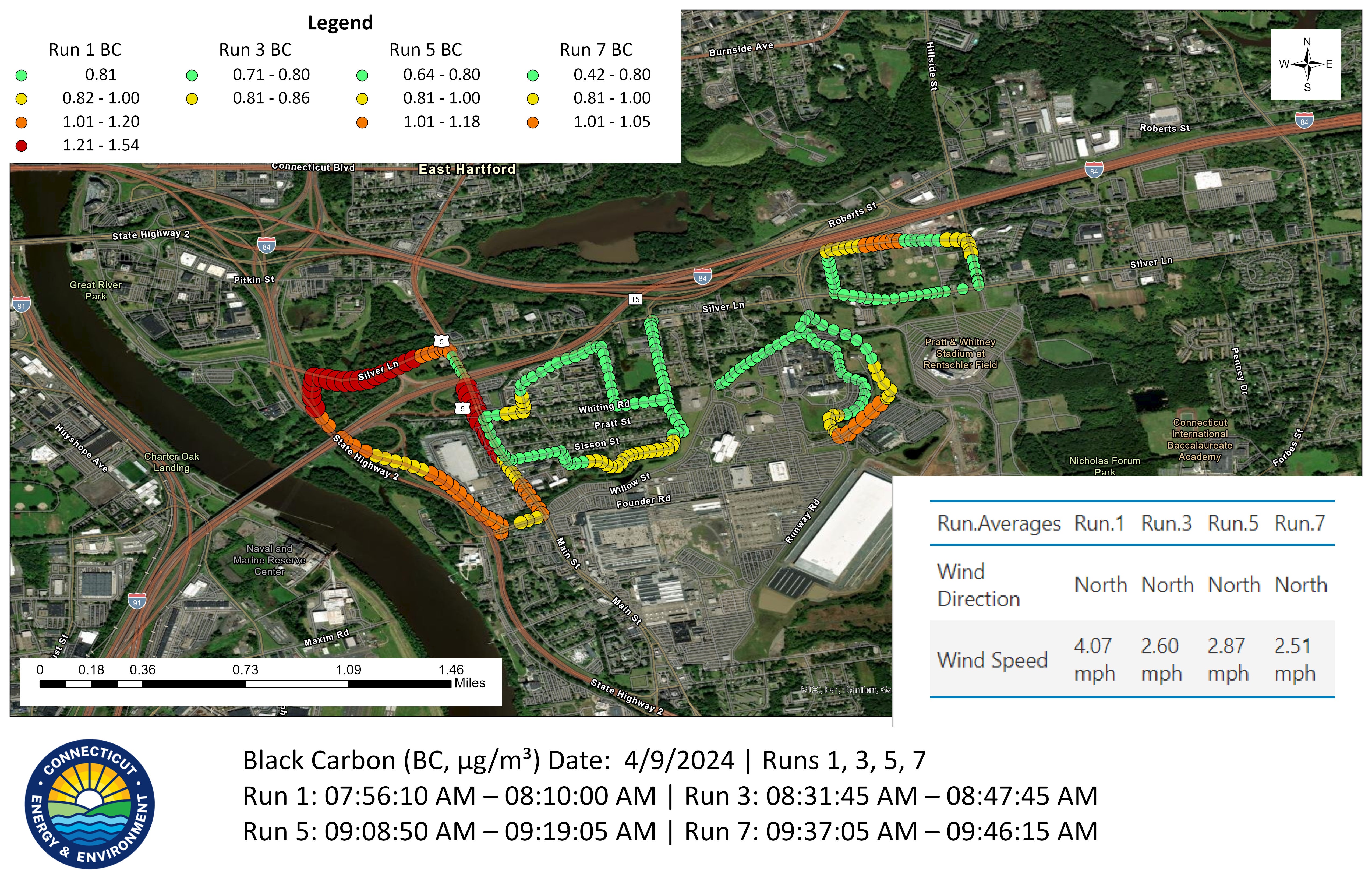 GMAP is a mobile air monitoring vehicle designed to measure the concentration of multiple air pollutants, many in real time.  The vehicle is equipped with gas and particulate analyzers, various meteorological instruments, and high-precision GPS.  These instruments are collectively referred to as GMAP, which stands for “geospatial measurement of air pollution,” and the data collected by the GMAP vehicle can be used to better understand local air quality. The GMAP vehicle provides the benefits of a “Next Generation Compliance” tool and further DEEP’s commitment to protecting air quality and public health and promoting environmental justice. GMAP data can be plotted on a map or over satellite imagery, as below.