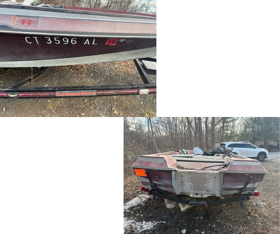 In Connecticut, a vessel is considered abandoned if it is: • Left on someone’s property for more than 24-hours without the property owner’s permission; • Found free floating and unattended on the waters of the state for more than 24-hours (you should note the position of the vessel and notify DEEP Emergency Dispatch at 860-424-3333 before taking the vessel into custody); • Improperly registered and left on the waters of the state for more than 24-hours (this provision is intended for police or government use); • Left at a mooring for more than sixty days since payment for the mooring became overdue; (this provision is intended for municipal or harbormaster use) • Left at a commercial facility for more than one year since payment for storage became overdue; or,• Found during a declared public emergency in a public right-of-way.