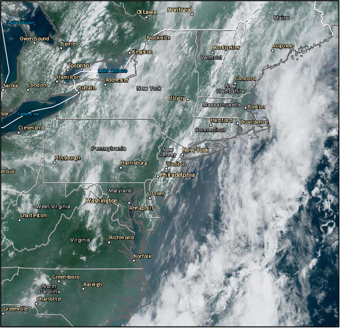 Visible Satellite Map, July 18, 2023, 12 p.m., showing smoke plume along the East Coast.