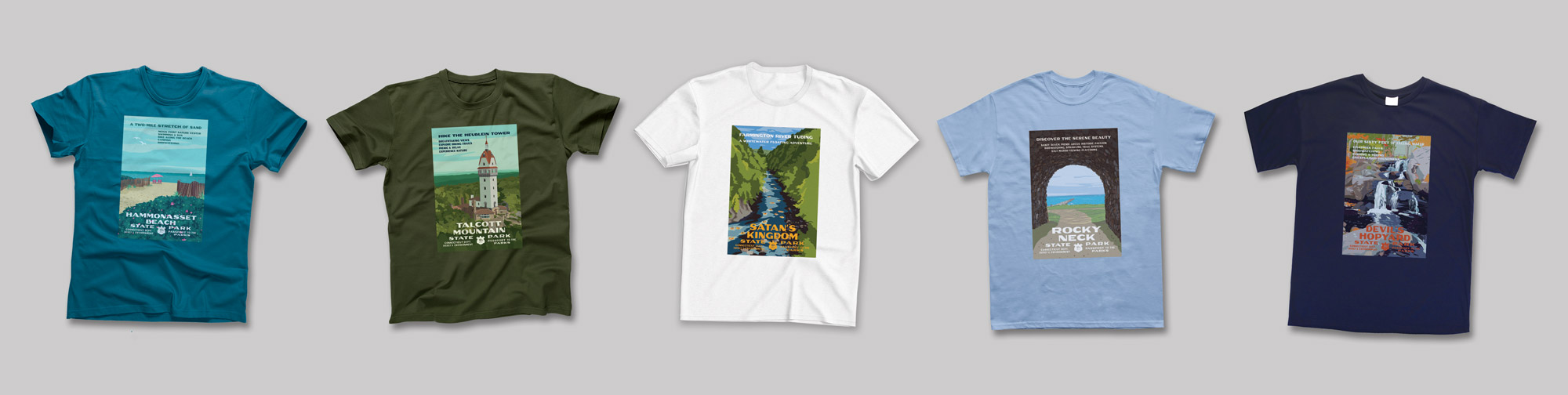To celebrate the impact of Passport to the Parks and the Legislature’s approved increase to Passport, DEEP unveiled in June two amazing Works Progress Administration-style graphics that DEEP’s own Joe Cunningham designed. We’ve since completed three more designs, including Rocky Neck State Park, and, just in time for Halloween, designs for two of our spookier-sounding parks, Satan’s Kingdom and Devil’s Hopyard! T-shirts showcasing these five fantastic graphics (Hammonasset, Satan’s Kingdom, Talcott Mountain, Rocky Neck, and Devil’s Hopyard), are available to the public for purchase, and we will add posters for sale soon. To check out the T-shirts, visit our Shop CTParks website: Shop CT State Parks (ctparks.com). The shirts are available online for $23 in all five designs and in multiple colors. Any net proceeds go to the Passport fund—so you both get an awesome T-shirt and help support this great program.