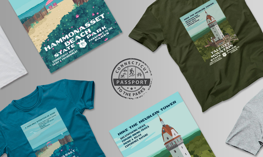 DEEP also announced Friday an exciting new opportunity for residents to show their love for their Connecticut State Parks, unveiling new Parks-themed T-shirts designed by DEEP’s very talented visual media designer, Joe Cunningham. The designs are modeled after the old Works Progress Administration posters advertising various National Parks, elegant in their simplicity and timeless look, and currently enjoying a renewed popularity. Shirts for Hammonasset and Talcott Mountain are currently available, with more Park designs on the way! Any net proceeds from sales of these shirts will go to the Passport fund.