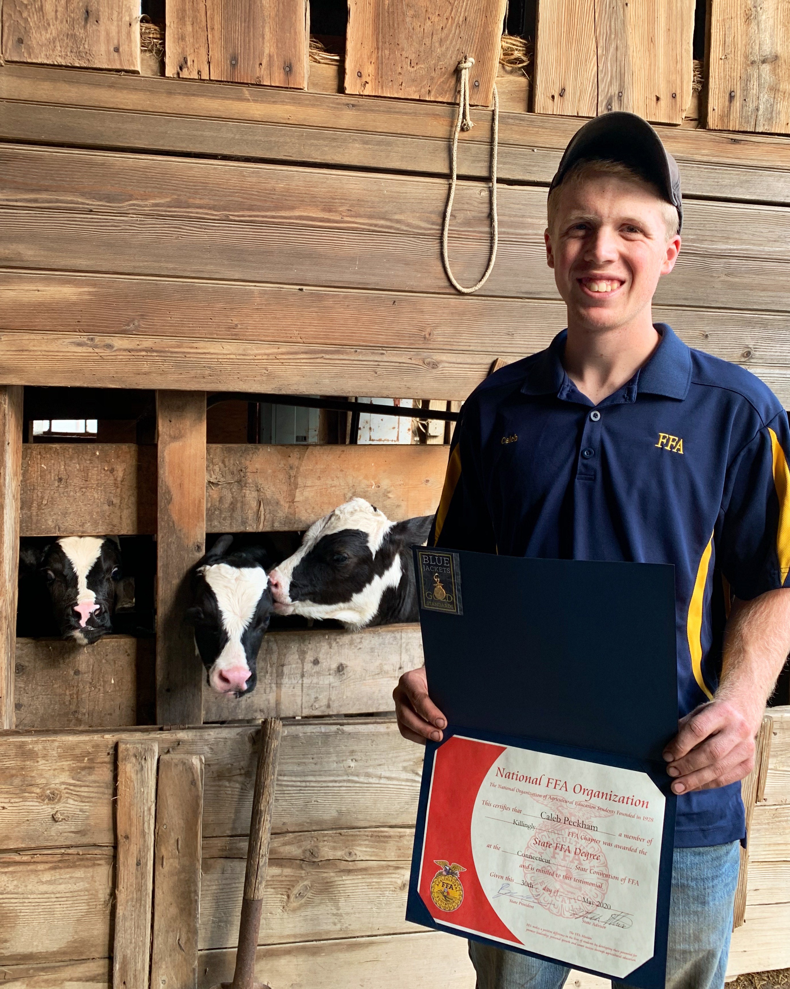 (HARTFORD, CT) – Cheers erupted in Caleb Peckham’s home on October 27, opening night of the 93rd National FFA Convention & Expo, as he was named the national winner in the Dairy Production – Placement Proficiency category. A seventh-generation dairy farmer from Woodstock, CT, Caleb graduated from Killingly FFA earlier this year where his SAE, or Supervised Agricultural Experience, focused on nearly all aspects of his family’s Elm Farm, home of a 150 Holstein and Jersey milking herd.