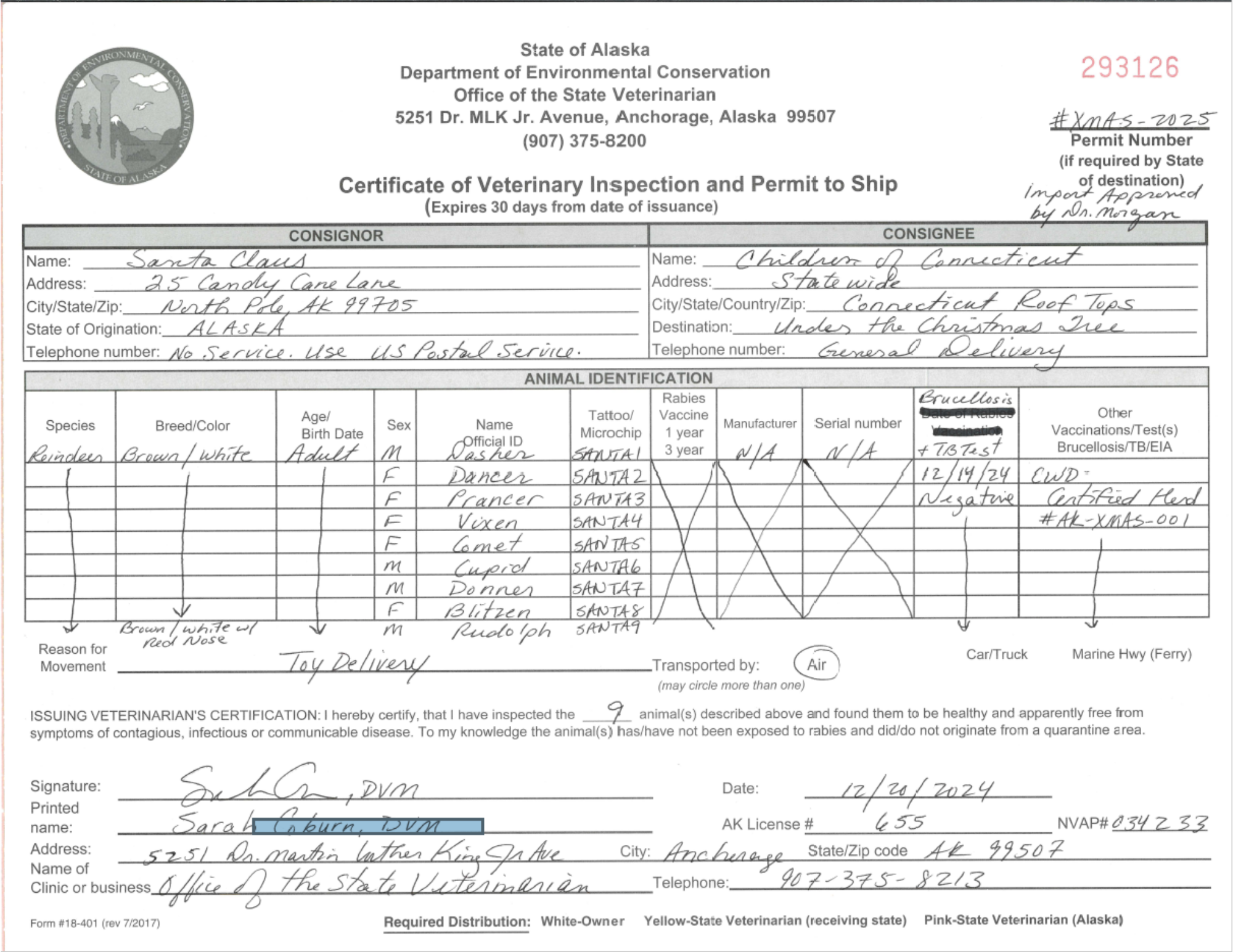 In preparation for their journey, Santa’s reindeer have been keeping in top shape with plenty of reindeer games and have passed all necessary health checks. Alaska State Veterinarian Dr. Sarah Coburn confirmed that the team is free of brucellosis and tuberculosis, and they come from a Certified Chronic Wasting Disease (CWD)-free herd. Connecticut’s State Veterinarian, Dr. Thamus Morgan, has reviewed their Certificate of Veterinary Inspection and declared them fit for “toy delivery by air” to the “children of Connecticut.”
