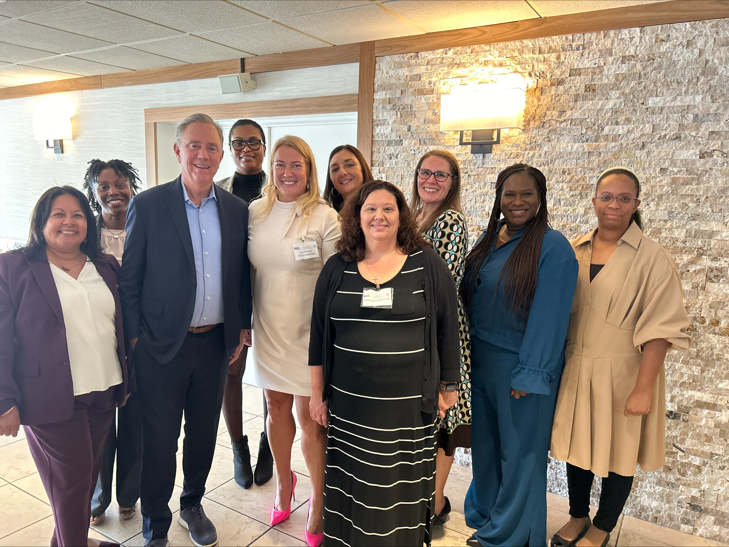 Karolina Wytrykowska (DMHAS) Committee Chair, Erica Blackmon (MIL), Talitha Coggins (DSS), Susan Cunningham (DCF), Valarie Lilley (DCF), Maribel Martinez (DCF), Kimberly Paluska (OEC), Jean Stack (DDS), Camise Turner-Evans (DMHAS) pictured with Governor Ned Lamont.