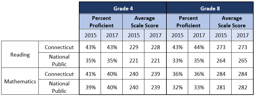The report shows that Connecticut’s overall student performance in Grades 4 and 8 in reading and mathematics is stable when compared to results from the last administration of NAEP in 2015 for all students and student groups. Connecticut scored higher than the nation in reading in Grades 4 and 8 and in Grade 8 mathematics, while the state’s fourth graders performed the same as the nation in mathematics. Additionally, over the six-year period from 2011 to 2017, fourth graders are showing progress in reducing the achievement gap in reading.