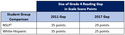 Fourth graders are showing progress in reducing the achievement gap in reading over time. There are promising changes when comparing student group performance in 2017 to performance in 2011, the beginning of Connecticut’s shift toward new content standards and higher expectations. The achievement gap between economically disadvantaged students and their non-disadvantaged peers is narrowing in Grade 4 reading. The data show a 6-point decline in the gap from 35 scale score points in 2011 to 29 scale score points in 2017. There is also evidence of reduction in the gap between white and Hispanic students on this same measure; in this case, the data show a 10 point decline in the gap from 35 scale score points in 2011 to 25 scale score points in 2017. In both cases, the changes are statistically significant.